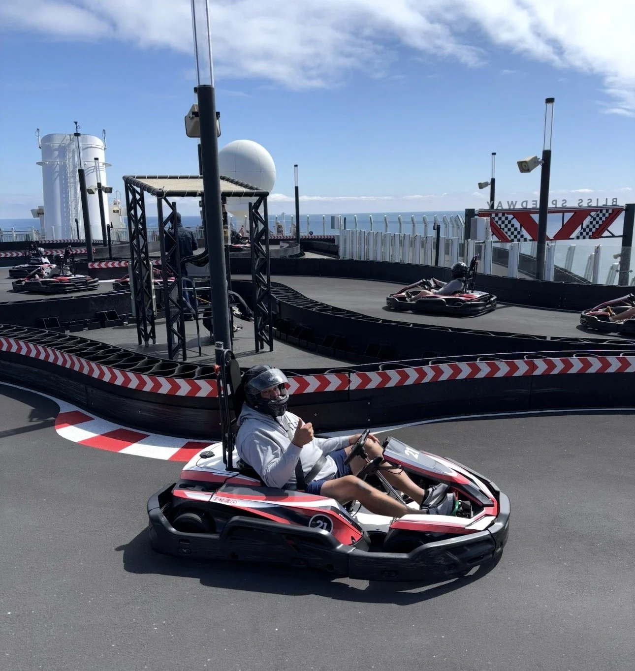 Racing at sea! A few of our group took on the Norwegian Bliss Speedway — and yes, the cars are faster than you’d expect. Definitely one of the most unique things you can do on a cruise ship.